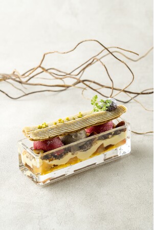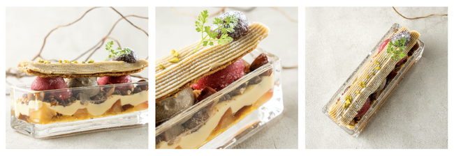 【構成】柑橘ジャム/ほうじ茶ゼリー/リンゴコンポート/ディプロマットクリーム/スポンジ/ほうじ茶アイス/クルミキャラメリゼ/メレンゲ/無糖シャンティ/カシスソース/モンブランクリーム/粉糖/チャービル/ピスタチオ