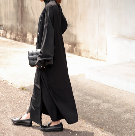 黒でまとめたワントーンコーデがこちら。足元でキラリと光るチャームがアクセントになり、スタイリッシュなコーデに大人可愛さをプラスしてくれます。