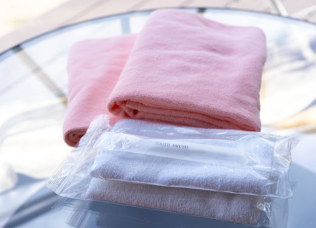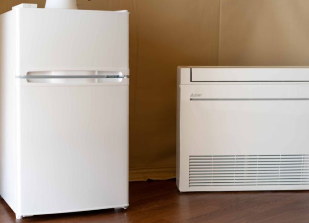 タオル、歯ブラシ、シャンプー、ボディーソープ類などもご用意しており、さらに軽食を持ち込んでも安心の冷蔵庫やオールシーズン対応のエアコンも完備。