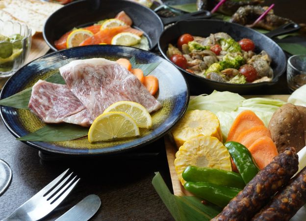 肉質が柔らかく、味覚も優れた霜降り肉のとちぎ牛や、淡白な味でお酒にも合うイワナなど栃木県や那須塩原の地元食材をふんだんに使った豪快な「グランピングBBQプラン」