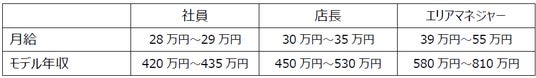 ※モデル年収は月給×12ヵ月に直近の平均評価の賞与実績(年3.0ヵ月)を加算して算出、残業代は別途支給(社員・店長)、エリアマネジャーは職位手当を含む