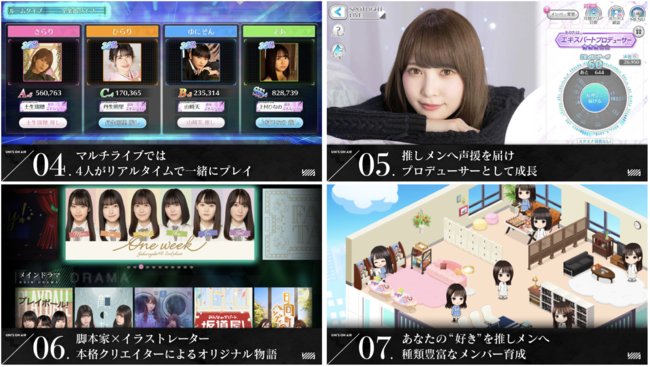 オリジナルの短編物語「ドラマ」や ちっちゃいメンバーと触れ合う「事務所」など、グループの世界観に触れられる機能を多数実装!