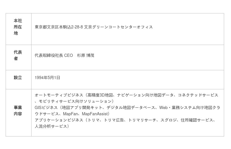 我々の使命は、「地球を喜びで満たそう」です。1994年にマルチメディアソフトウェア開発会社として創業し、翌年には「MapFan」が日経ベストソフト賞を受賞、その後、国内初のiモード地図で日経新聞社賞を受賞、世界初の通信カーナビを発表するなど、イノベーションを起こしてきました。さらに進化し、法人向けの地図データや位置情報ソリューションの提供はもとより、高度な自動運転の実現に不可欠な高精度3次元データ地図の提供も行うなど、地図のメジャーカンパニーとして日本の地図業界を牽引しています。