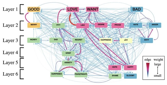 本研究では、言語のcolexificationに着目することで、さまざまな感情と意味的類似性を有する中心的感情を抽出することを試みました。その結果、他の多数の感情と関連性の高い、ハブとなっている中心的概念は「GOOD」、「WANT」、「BAD」、「LOVE」の4つであることを見出しました。本研究をさらに発展させることで、革新的な自然言語処理、感情分析手法の確立に貢献することが期待されます。
