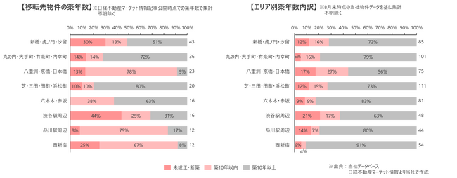 他方、西新宿エリア、品川駅周辺エリアへの移転では、「未竣工・新築」、「築10年以内」ビルへの移転の割合が高かったものの、当該エリアにおいては「未竣工・新築」、「築10年以内」ビルの割合は低く、一部の比較的新しいビルに移転が集中していると推察される。