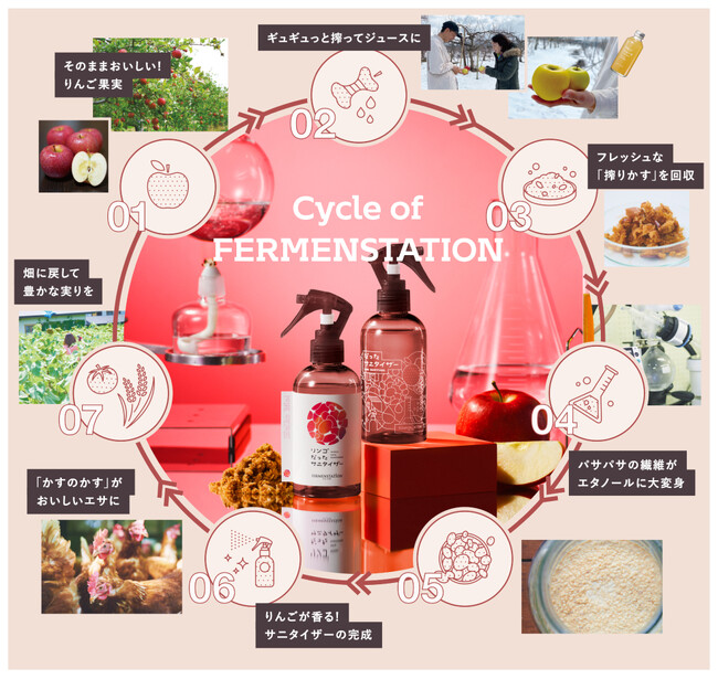 りんごを絞ってジュースを作り、搾りかすからエタノールを生成し、リンゴの香りのするサニタイザーが生まれている。