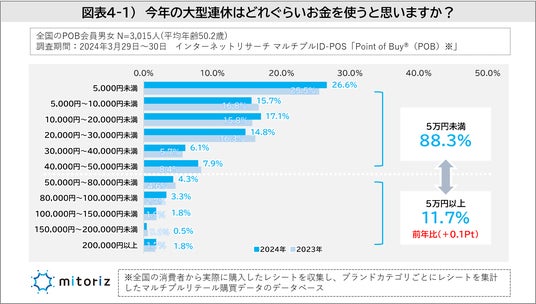 大型連休の予算について尋ねたところ、2023年と比較して5万円以上の比率がわずかに増えているものの、2023年と同様に最も多い回答は5,000円未満(26.6%)となり、全体的に2023年と大きくは変わらない結果となりました(図表4‐1)。