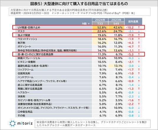 大型連休に向けて購入する予定の日用品を調査したところ「UV・日焼け止め(52.8%)」「マスク(22.6%)」「虫よけ関連(19.6%)」が上位に続きました。2023年と比較すると「UV・日焼け止め(+10.2Pt)」「虫よけ関連(+7.9Pt)」をはじめとするレジャーや外出に関連する商品の購入予定が増加傾向にあります。また、5月は花粉飛散にもまだ注意が必要なため「目・鼻・口・のどに関する医薬品類(+5.3Pt)」が伸長、「マスク」も花粉症対策のほか、引き続き感染症予防を必要とする声もあり2割が購入予定と回答しています(図表5)。