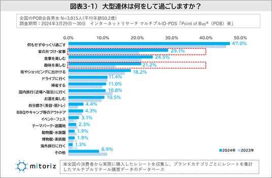 大型連休の過ごし方は、「何もせずゆっくり過ごす(47.0%)」が最も多く、次に「家の片づけ・家事(29.1%)」「食事を楽しむ(24.5%)」と続きました。2023年に比べ「家の片づけ・家事(+8.4Pt)」が順位を上げており「食事を楽しむ(+3.2Pt)」「趣味を楽しむ(+7.5Pt)」「街やショッピングに出かける(+1.8Pt)」といった項目が上昇しています(図表3‐1)。