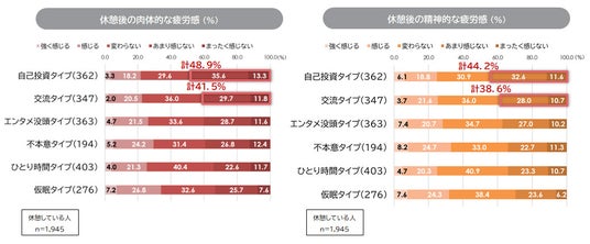 10. 休憩後の肉体的な疲労感を感じない割合は「自己投資タイプ(計48.9%)」、次いで「交流タイプ(計41.5%)」が高かった。また、休憩後の精神的疲労感を感じない割合は「自己投資タイプ(計44.2%)」、次いで「交流タイプ(計38.6%)」が高かった。