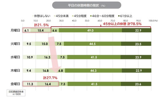 週末に向かい、休憩時間が短くなっていくことに注意が必要だ。休憩の過ごし方が変化することも関係しているだろう。