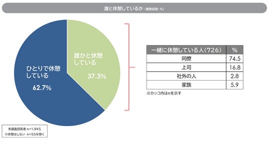2. 誰と休憩しているかについて、誰かと一緒に休憩を取っている人は37.3%であった(同僚・上司・社外の人・家族)。一方で、ひとりで休憩している人は62.7%であった。