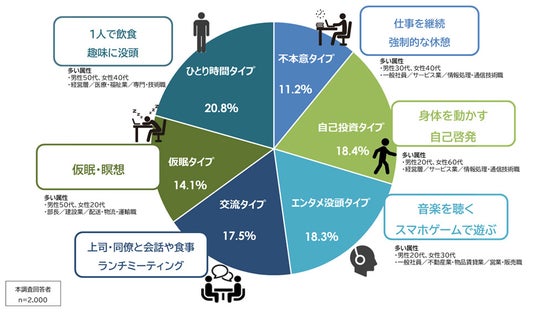 8. 休憩の過ごし方を類型化したところ、1.不本意タイプ(仕事を継続・強制的な休憩)、2.自己投資タイプ(身体を動かす・自己啓発する)、3.エンタメ没頭タイプ(音楽を聴く・スマホゲームで遊ぶ)、4.交流タイプ(上司・同僚と会話や食事・ランチミーティング)、5.仮眠タイプ(仮眠・瞑想)、6.ひとり時間タイプ(1人で飲食・趣味に没頭する)の6つのタイプに分類され、それぞれ異なる効果が見られる。