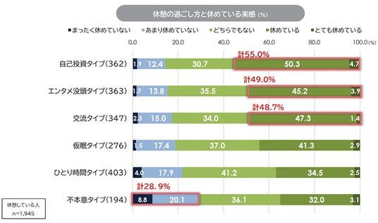9. 休めている実感の割合が高かったのは、「自己投資タイプ(55.0%)」、「エンタメ没頭タイプ(49.0%)」、「交流タイプ(48.7%)」の順であった。