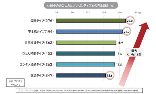 11. 休憩の過ごし方とプレゼンティズムの発生割合において、最も高かったのは「仮眠タイプ(22.0%)」、次いで「不本意タイプ(21.0%)」であった。一方で、最も低かったのは「交流タイプ(15.6%)」であった。