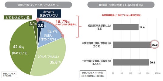 4. 休憩で休めていない実感がある人は18.7%であった。職位別にみると、中間管理職(22.0%)、一般社員(20.6%)、経営層(14.6%)の順であった。