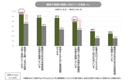 休めていると実感できることが、業務パフォーマンスを高める要素だと捉えることが必要だ。休めている実感がある人は「取得する際、上司や同僚は快く承認してくれる(65.0%)」といった、職場内でのピア効果も確認できた。上司や同僚も、休憩を進んで取得する習慣・文化の醸成が重要である。