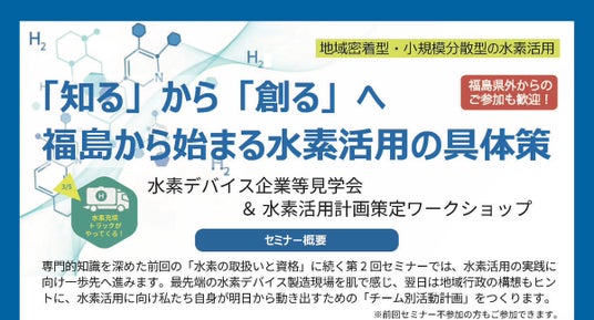 本イベントは「『知る』から『創る』へ」をテーマに、最先端の水素デバイス製造現場の見学と、具体的な活動計画を策定するワークショップで構成されています。福島県内外を問わず、水素活用による新産業創出に関心のある企業・団体の皆様の参加を募ります。