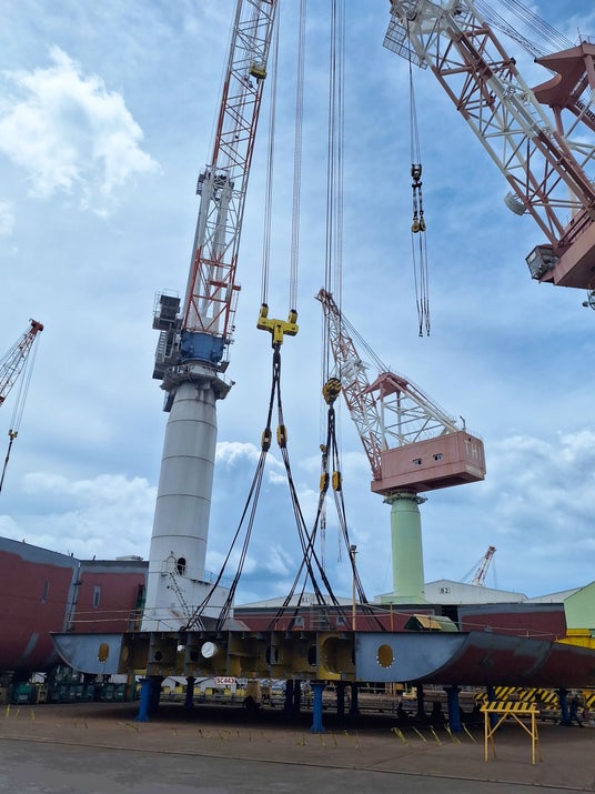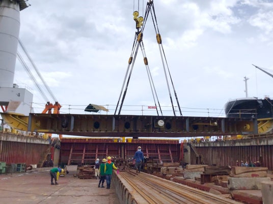 ジブクレーンで吊り上げられ、ドックに配置された最初のブロック
