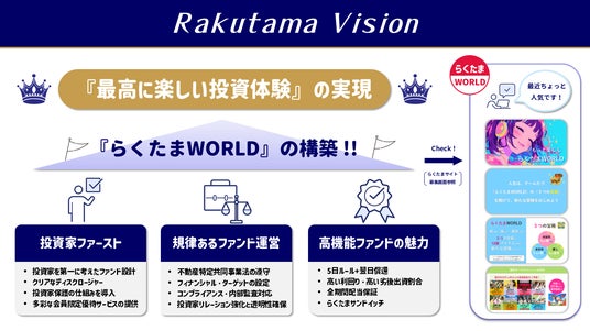 『らくたま』は、投資家ファーストを追求した『最高に楽しい投資体験』の実現を目指します。その実現に向けて、2025年は新世界『らくたまWORLD』の第一次構築を完了させます。『らくたまWORLD』は、世界でも類を見ない「不動産クラウドファンディング」と「優待サービス」の融合。業界初の「5日ルール+翌日償還(資金効率最大化)」「全期間配当保証」「らくたまサンドイッチ」など、収益性と安定性を両立させながら、投資家の皆さまに、より豊かな投資体験をお届けします。