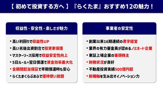 『らくたま』事業の独自性・透明性・ファンド運用能力、また、らくたまの安心と楽しさについてご紹介していますので、ぜひご確認ください。