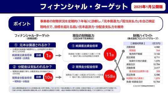 『らくたま』では、透明性と健全性を重視し、投資家が事業者の財務状況を的確に把握できるよう、独自の財務目標(フィナンシャル・ターゲット)を設定し、公表しています。この財務目標は、投資家への元本償還と安定的な配当の実現を目的としたものであり、事業者はこの目標達成を経営の最重要課題と位置付け、規律ある事業推進を行っています。