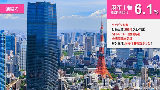 対象物件は都心一等地の麻布十番で、劣後出資比率55%で投資家保護、翌日償還・全期間配当保証付きで魅力的な機能満載の高機能ファンドとなります。