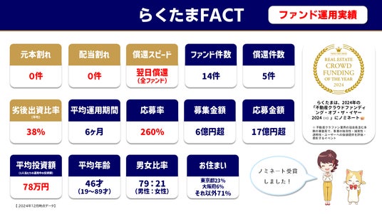 2024年の『らくたま』は、14件のファンド組成を行い、元本割れゼロ、配当割れゼロ、全ファンド翌日償還、劣後出資比率38%での投資家保護、応募率は260%に達し、2024年12月には「不動産クラウドファンディング・オブ・ザ・イヤー2024」にノミネート受賞しました。これもひとえに、らくたま会員の皆様からの温かいご支持の賜物と深く感謝しております。