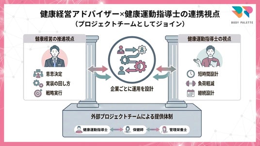 当社は、健康運動指導士・保健師・管理栄養士と連携し、社内に専任の推進チームがない企業でも、外部プロジェクトチームとしてジョインできる体制を想定しています。