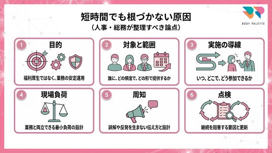 具体的な運動メニュー、時間割、実施手順、チェックリスト本文は掲載せず、企業ごとに設計すべきポイントを中心に整理します。