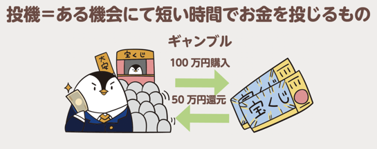 「一方で、一般的なギャンブルは、短期間で利益を得ようとする「投機」であり、買った当日や数日後に結果が出るパチンコや競馬、宝くじがその例です。」