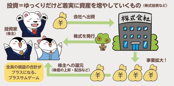 「投資家は将来が期待できる会社の株を買い、会社は株で集めた資金で新製品・サービスを開発します。会社の業績が上がると、その会社に投資したい人がさらに増えて株価が上がり、株主に還元される利益が大きくなります。成長する企業の株を長期間持ち続けていれば、受け取れる利益も増えていく。これが株式投資の考え方の基本です。」