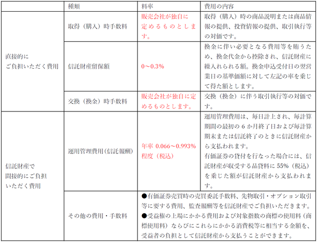 ※費用の種類や料率等は販売会社や個々のETFによって異なります。上記費用の料率は大和アセットマネジメントが運用する一般的なETFの料率を表示しております。※売買委託手数料などの「その他の費用・手数料」については、運用状況等により変動するため、事前に料率、上限額等を示すことができません。※取得(購入)時手数料、交換(換金)時手数料について、くわしくは販売会社にお問合わせください。※手数料等の合計額については保有期間等に応じて異なりますので、表示することができません。※詳しくは、投資信託説明書(交付目論見書)をご覧ください。