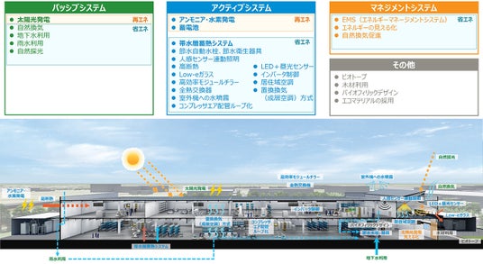 生産エリアには、地中熱の利用により従来の空調システムに比べ約52%のエネルギー削減が見込める帯水層蓄熱空調システムや、置換空調(成層空調)システム、オフィスエリアには、シミュレーションにより設計された自然換気や採光とともに、高効率空調機や人感センサによる連動照明など、多様な省エネルギーソリューションを取り入れています。また、屋上の太陽光発電・蓄電池など創エネルギーソリューションを採用することに加え、ビオトープなどの資源循環や自然共生(生物多様性)につながる技術も導入します。