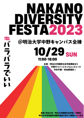 明治大学 国際日本学部 横田雅弘ゼミナールは、誰もがありのままで暮らせる中野区のまちづくりを目的として、中野区の多様なマイノリティ当事者団体や個人、多様性の受け入れに関心を寄せる企業、学校、NPO、行政などが参加するイベント「中野ダイバーシティフェスタ2023」を10月29日(日)に国際日本学部が所在する明治大学中野キャンパスで開催します。