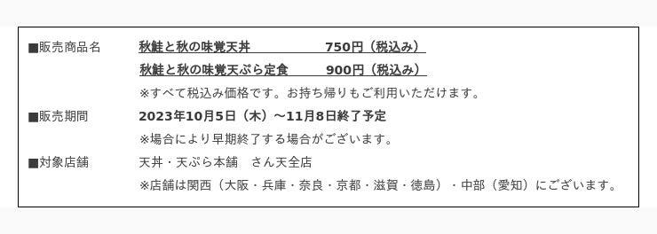 「秋鮭と秋の味覚フェア」商品に追加で「国産秋鮭天」を通常価格230円を20円お得にマシ(追加トッピング)ていただけます。