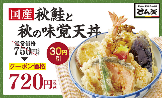 更に「天丼・天ぷら本舗 さん天」公式アプリでは、「秋鮭と秋の味覚フェア」30円引きクーポンを配信いたします。ぜひ、秋の味覚をお得にご利用ください。