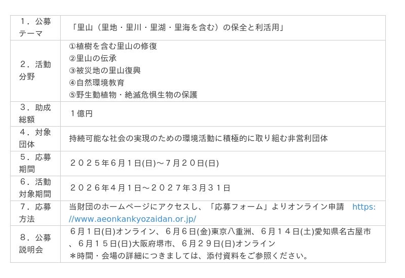 公益財団法人イオン環境財団(理事長 岡田元也 イオン株式会社 取締役兼代表執行役会長 以下 当財団)は、6月1日(日)から「第35回イオン環境活動助成」の公募を開始します。