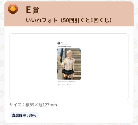 E賞:いいねフォト(50回引くと1回くじ) - 当選確率 36%
