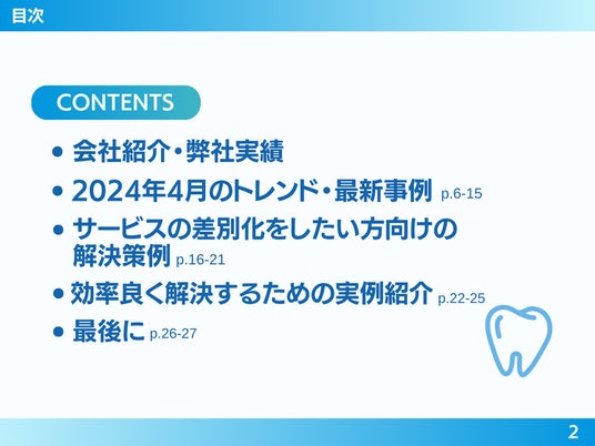本レポートのトピックは、歯科業界でサービスの差別化をしたい方向け2024年4月のトレンド、最新事例です。