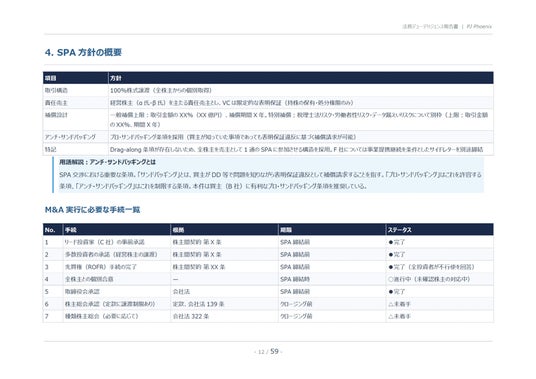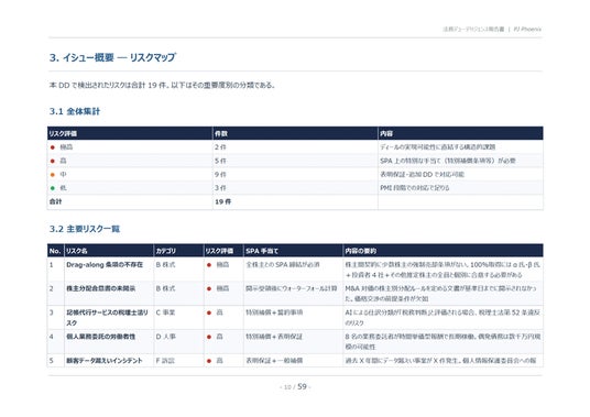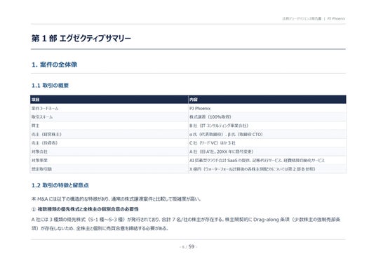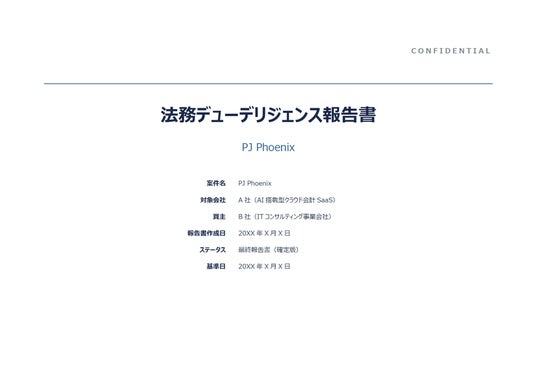 ※DDレポートサンプルは、架空の案件「PJ Phoenix」(AI搭載型クラウド会計SaaSを提供するスタートアップ企業の100%株式取得案件)を題材に作成されたものです。実在の企業・個人・案件とは一切関係ありません。