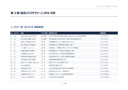 ※本リリースでは、AIが自動生成した法務DDレポートサンプルの中から、特に実務上のインパクトが大きい4~5ページを抜粋して掲載します。掲載ページは、エグゼクティブサマリー(リスクマップ)、カテゴリ別リスクサマリー、SPA方針の概要など、DDレポートの中核部分です。