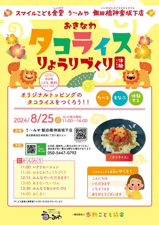 一般社団法人 感動こども協会(所在地:東京都新宿区、以下、当協会)の正会員である株式会社アムズシーヴイエス(本社: 東京都中央区)は、沖縄料理居酒屋に併設するスマイルこども食堂「う~みや 飯田橋神楽坂下店」にて、2024年8月25日(日曜日)にイベント『タコライスりょうりづくりたいけん』を開催します。