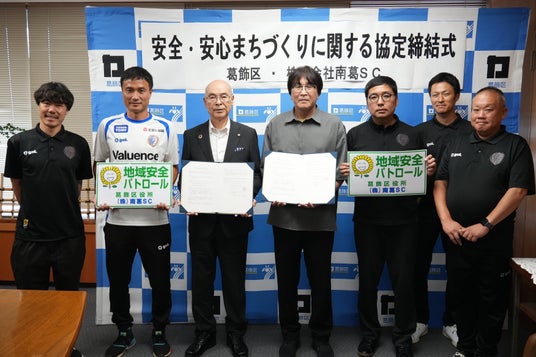 6月27日(金)、葛飾区は株式会社南葛SCと「安全・安心まちづくりに関する協定」を締結しました。この協定は、「犯罪のない安全で安心して暮らせるまちづくり」の実現を目的に、犯罪防止を呼びかける自動車用パネルを装着してのパトロール活動や、地域安全に関するイベントへの参加など、地域安全活動に協力して取り組むものです。