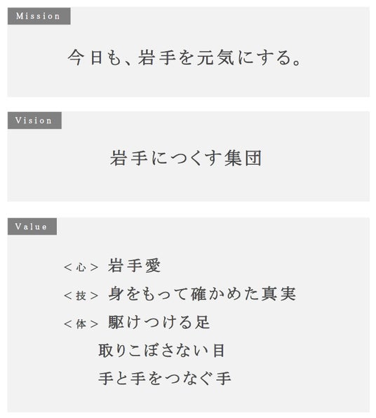 大事にする価値観や行動指針となるバリューは、「〈心〉岩手愛」「〈技〉身をもって確かめた真実」「〈体〉駆けつける足 取りこぼさない目 手と手をつなぐ手」としました。