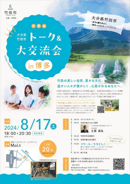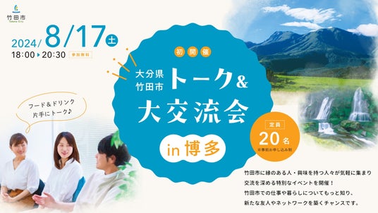 大分県竹田市(運営:株式会社Asian Bridge)は、博多で初めてとなる「トーク&大交流会」を8月17日(土)に開催します。