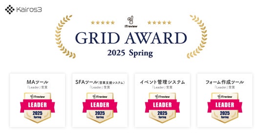 カイロスマーケティング株式会社(本社:東京都渋谷区、代表取締役:佐宗 大介、以下「当社」)が提供する、“次の一手“がデータでわかるMA+SFA一体型ツール「Kairos3(カイロススリー)」は、「ITreview Grid Award 2025 Spring」において、最高位である「Leader」を4部門にて受賞したことをお知らせいたします。