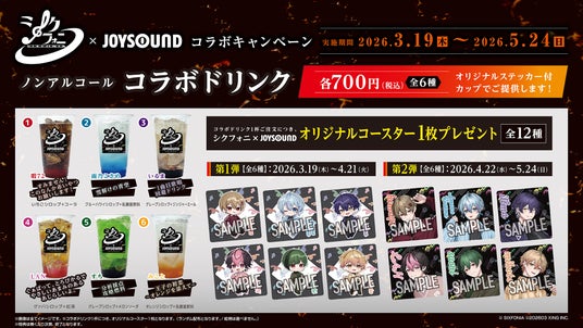 さらに、コラボドリンクをご注文いただいたお客様には、1杯につき1枚「オリジナルコースター」をランダムでプレゼントいたします。コースターは全2弾で展開され、第1弾は等身描き下ろしイラスト6種を2026年3月19日(木)から4月21日(火)まで、第2弾はミニキャラ描き下ろしイラスト6種を4月22日(水)から5月24日(日)まで配布いたします。なお、特典は数量限定のため、無くなり次第終了となります。