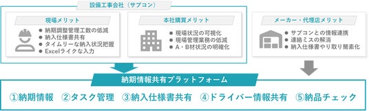 本プラットフォームは設備工事会社(サブコン)、メーカー、代理店が個別管理していた数千~数万に及ぶ設備資機材情報をクラウド上で情報を一元管理し、双方向的な情報アクセスを実現することで、連絡ミスや情報齟齬を解消し、建設工事全体の進捗に応じて柔軟な対応が求められる納期調整業務の効率化及び負荷軽減に寄与することを本実証実験で検証・分析します。