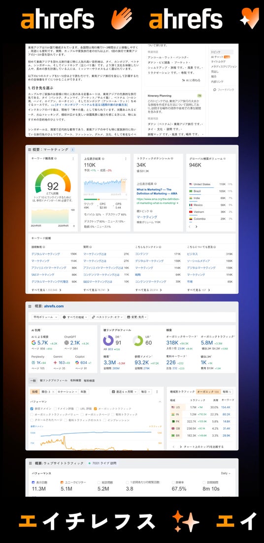Ahrefs Pte. Ltd. (エイチレフス)は、世界トップレベルの規模を誇る独自クローラーとデータ技術により正確かつ鮮度の高いデータを収集・解析し、世界をリードする SEO 分析機能を主軸とし、AI 検索分析、AI コンテンツ作成、ウェブトラフィック分析、SNS 投稿などマーケティング機能を網羅したオールインワン・マーケティングツール「Ahrefs(エイチレフス)」を開発・提供しています。世界 180 カ国以上を超えるユーザーに利用され、競合分析からコンテンツ戦略まで、データに基づいた効果的なマーケティング戦略の立案・実行を支援しています。